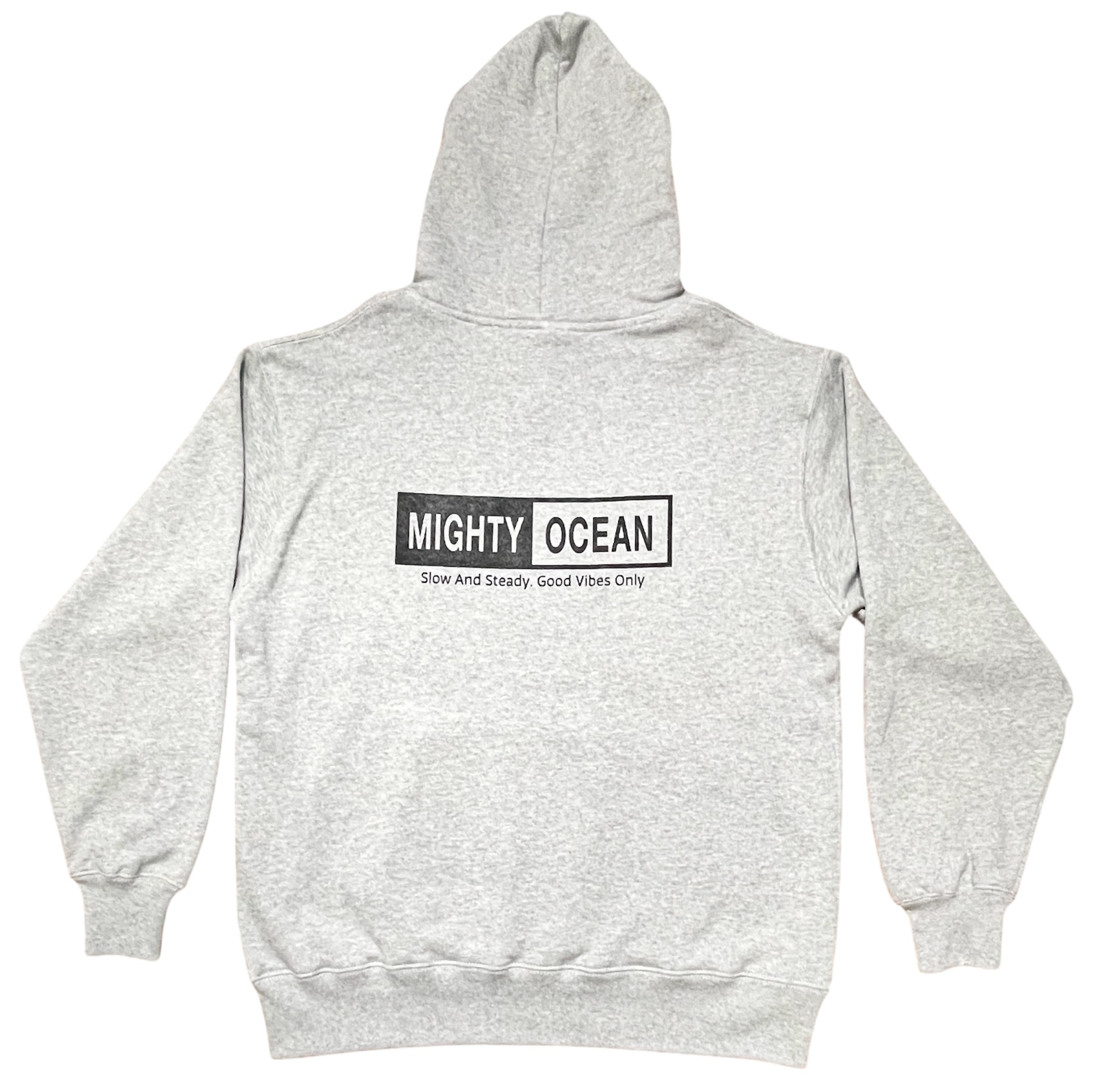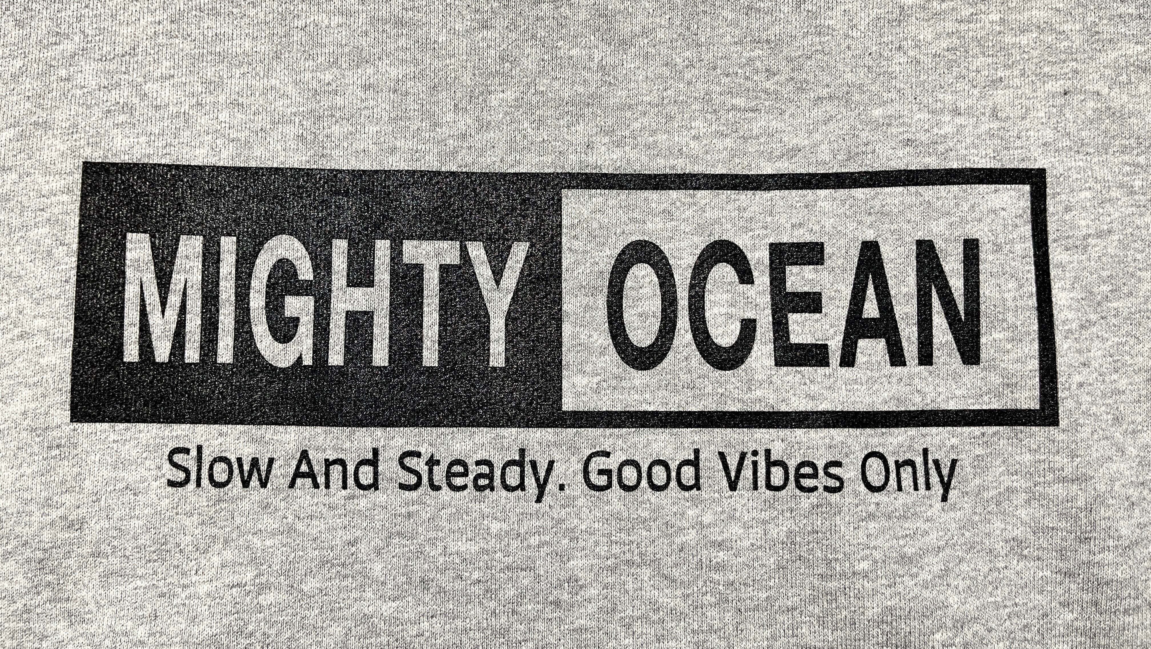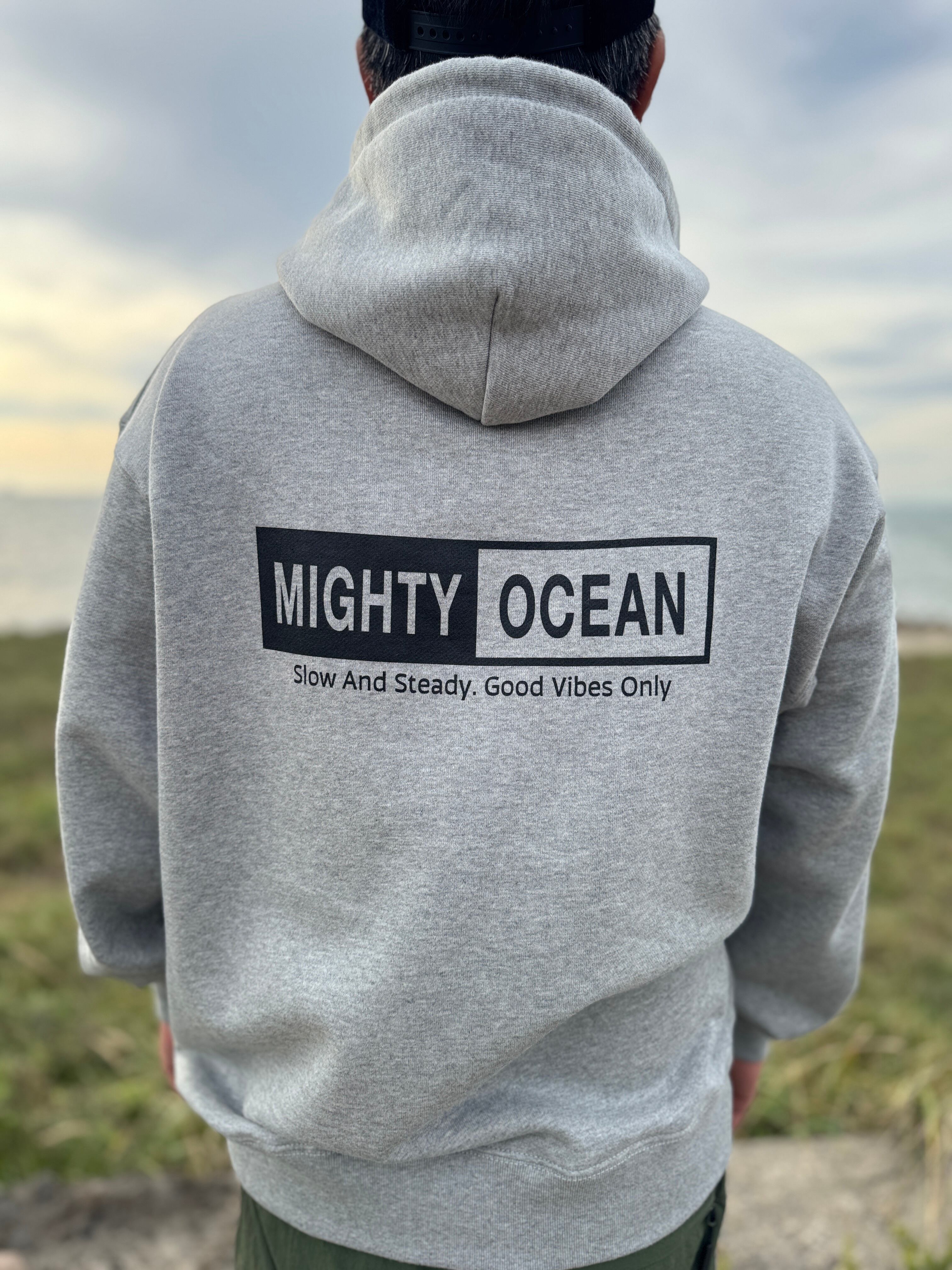 左胸に小さなボックスロゴ、バックにはSlow and steady,Good vibes onlyのメッセージと大きなボックスロゴをプリント。
